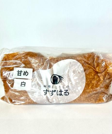 国産米、国産麦、国内製造天日塩のみを使用した天然醸造、減塩の安心安全の美味しいお味噌です。米麹、豆麹、黄麦麹、麦白麹の4種類の麹の特徴を活かしたすずはるオリジナルの5種類の出来上り味噌。すずはるの蔵でしっかりじっくり美味しい味噌に醸造されています。減塩なので約1年半程の賞味期限としている為、作り過ぎない様にしています。その為、その年その年で完売となる大変人気の味噌です。又、出来上り後も全く手を加えていない為、麹がゴロゴロ残る昔ながらの味噌となっています。他の味噌ではもうダメなのよ、とよく仰って頂ける、懐かしいお味の出来上り味噌です。当店の通常の米味噌の倍近い量の麹を入れているので、甘みの強いお味噌に出来上っています。麹の量が多いと発酵も早く、熟成の進んだ味噌とは又違う味わいがあります。甘めの早出し味噌、どうぞお試しください。